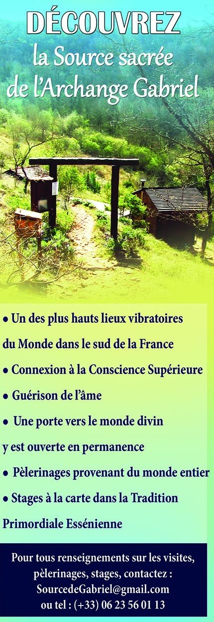 La Source de l’Archange Gabriel est un lieu unique au monde. C’est un endroit magique où tout homme, toute femme, qui veut retisser ou renforcer le lien avec son âme, peut se rendre pour trouver la Lumière. Cette source sacrée reçoit chaque année des pèlerins du monde entier. Dans ce sanctuaire, le chercheur de Lumière – qu’il soit Essénien ou non – se présente réellement devant Dieu et peut communier avec Lui, avec sa Douceur, sa Force, sa Présence, son Amour océanique, par Son messager, l’Archange Gabriel.